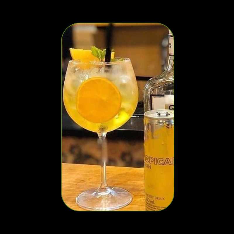 Gin, Energético Red Bull Tropical, Meia dose de xarope de limão siciliano e Especiarias